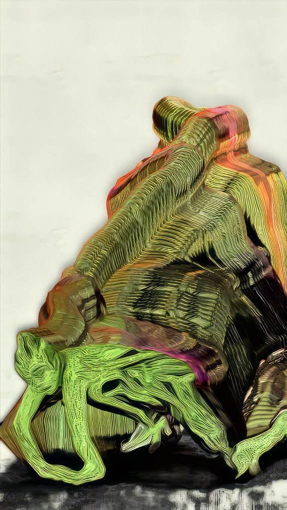Je me vois rouler mes poings et mes poignets, essayer de détendre mes mains. Ces mains avec lesquelles je ressens la douleur, mais avec lesquelles je crée aussi, ces mains avec lesquelles je dessine, je peins et je crée mes propres mondes. Je vois mon dos qui s’efforce de me maintenir en place, mais tant de pression et de tension s’exercent sur mon dos, mon abdomen, mon utérus. Tant de tension, et je me vois essayer de m’étirer de toutes mes forces.